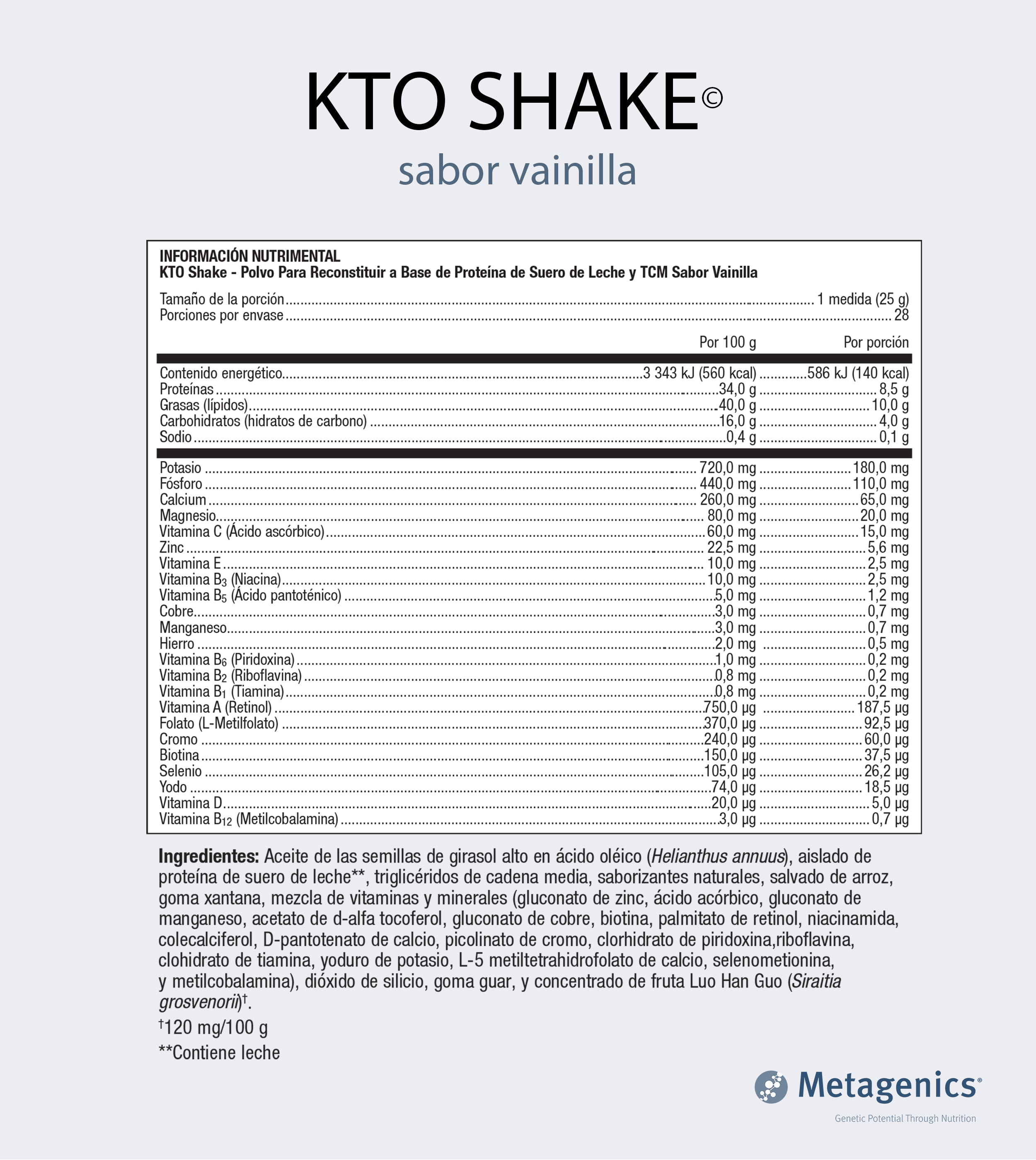 • Proteína de suero leche de alto valor biológico, con triglicéridos de cadena media (MCT Oil), incluyendo C8 y C10 de rápida conversión.