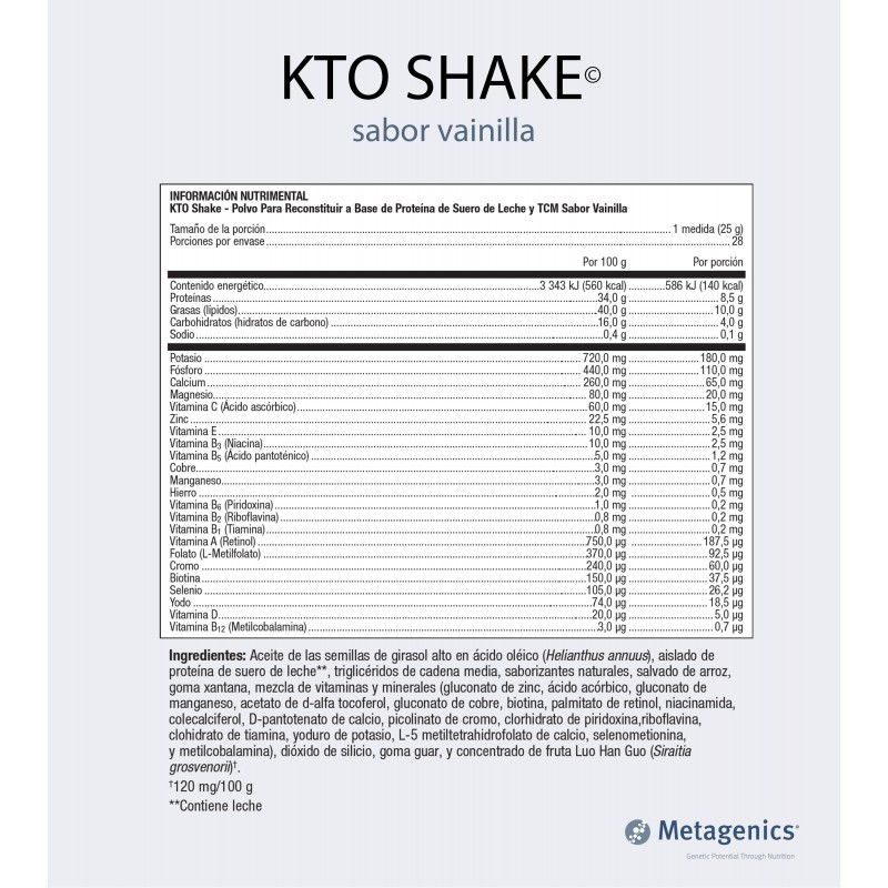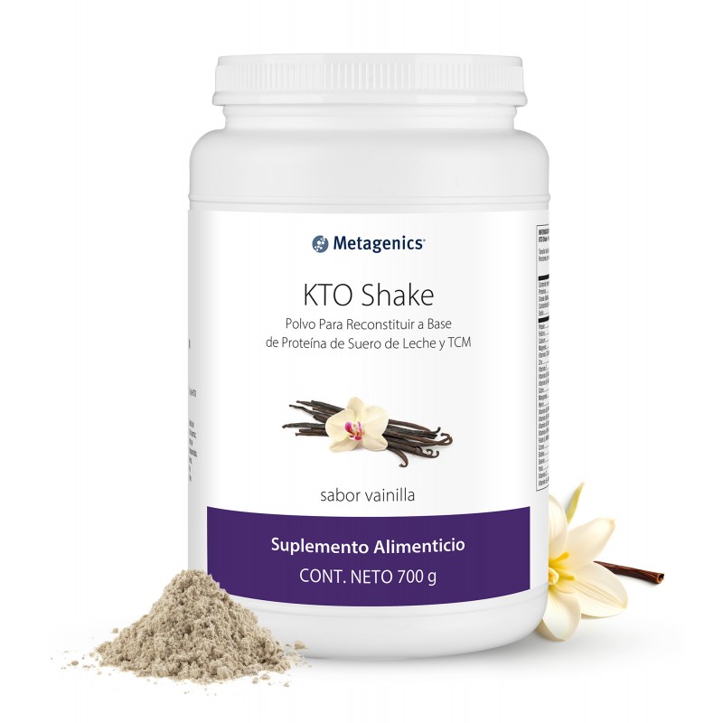 KTO Shake: Polvo para reconstituir a base de Proteína de Suero de Leche y TCM, sabor malteada de vainilla.