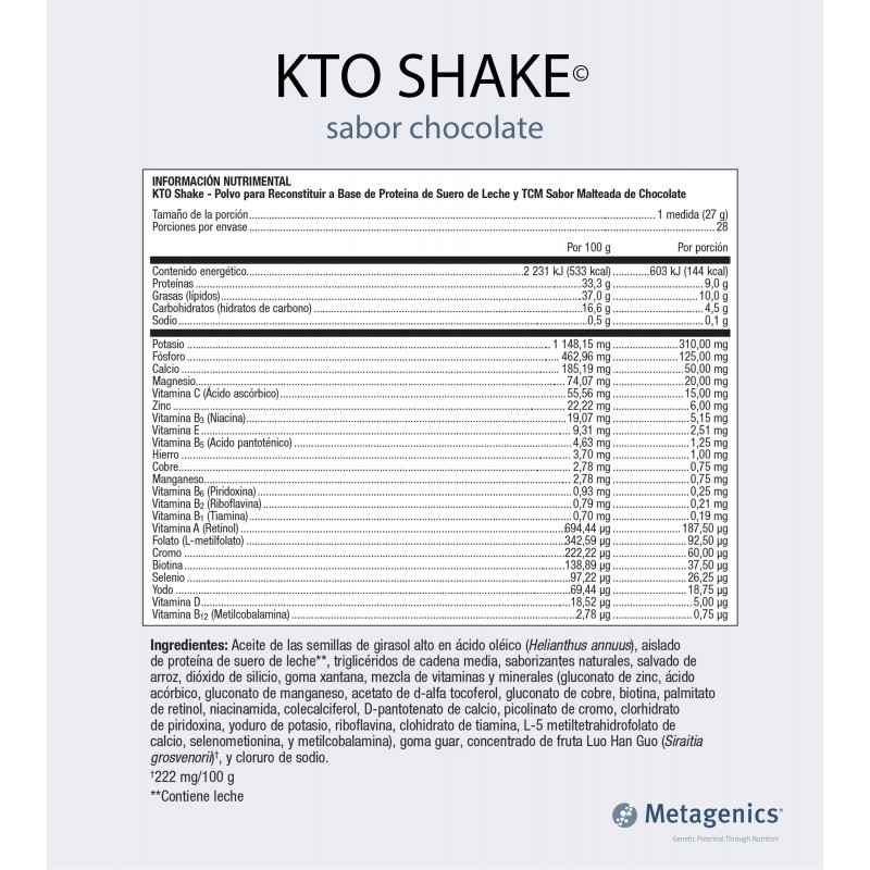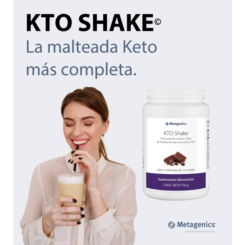 KTO Shake: Polvo para reconstituir a base de Proteína de Suero de Leche y TCM, sabor malteada de chocolate.